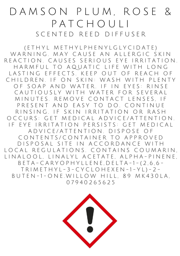 Flammable liquid. Do not light reeds, do not ingest. Keep out of the reach of children and pets. People suffering from perfume sensitivity should be cautious when using this product. Use gloves when handling reeds. Do not place diffuser directly onto polished, painted, plastic or leather surfaces or on electrical equipment. Accidental spillage may cause damage, in this case wipe liquid off immediately.