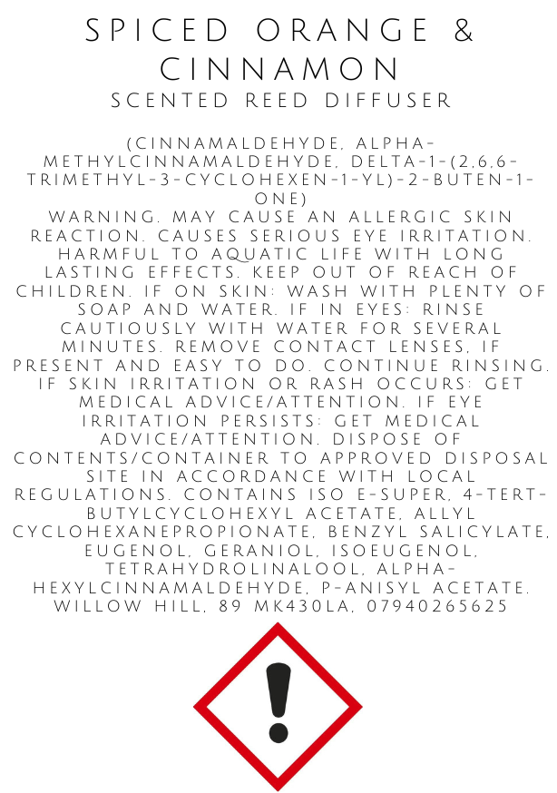 Flammable liquid. Do not light reeds, do not ingest. Keep out of the reach of children and pets. People suffering from perfume sensitivity should be cautious when using this product. Use gloves when handling reeds. Do not place diffuser directly onto polished, painted, plastic or leather surfaces or on electrical equipment. Accidental spillage may cause damage, in this case wipe liquid off immediately.