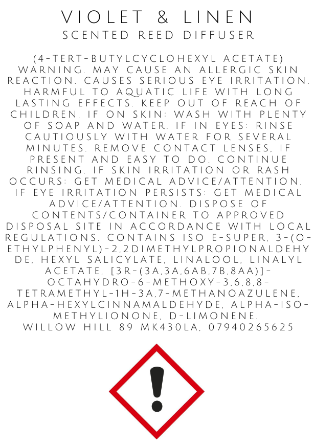 Flammable liquid. Do not light reeds, do not ingest. Keep out of the reach of children and pets. People suffering from perfume sensitivity should be cautious when using this product. Use gloves when handling reeds. Do not place diffuser directly onto polished, painted, plastic or leather surfaces or on electrical equipment. Accidental spillage may cause damage, in this case wipe liquid off immediately.